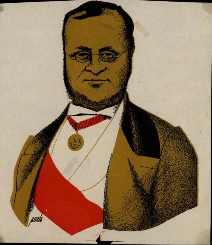 El busto de un hombre de frente se ha representado en este retrato firmado. Lleva una camisa blanca sobre la que lleva una banda de color rojo. Una chaqueta marrón se sitúa sobre la camisa. El personaje masculino tiene una piel oscura y una pequeña barba le crece en el rostro en el que también se destacan unas gafas. Una medalla dorada le cuelga del cuello.Prueba de imprenta. Ilustración realizada para la revista semanal de Novelas y Cuentos. Titulo: Autor: Nº publicado: Fecha: Tomo NC.