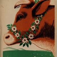 En este dibujo firmado, en el que el color verde está presente por los pastos que se vislumbran en el fondo de la composición, se ha representado la cabeza de perfil de una vaca marrón a la que se ha adornado con una corona de flores blancas y hojas verdes.Prueba de imprenta. Ilustración realizada para la revista semanal de Novelas y Cuentos. Titulo: Autor: Nº publicado: Fecha: Tomo NC.