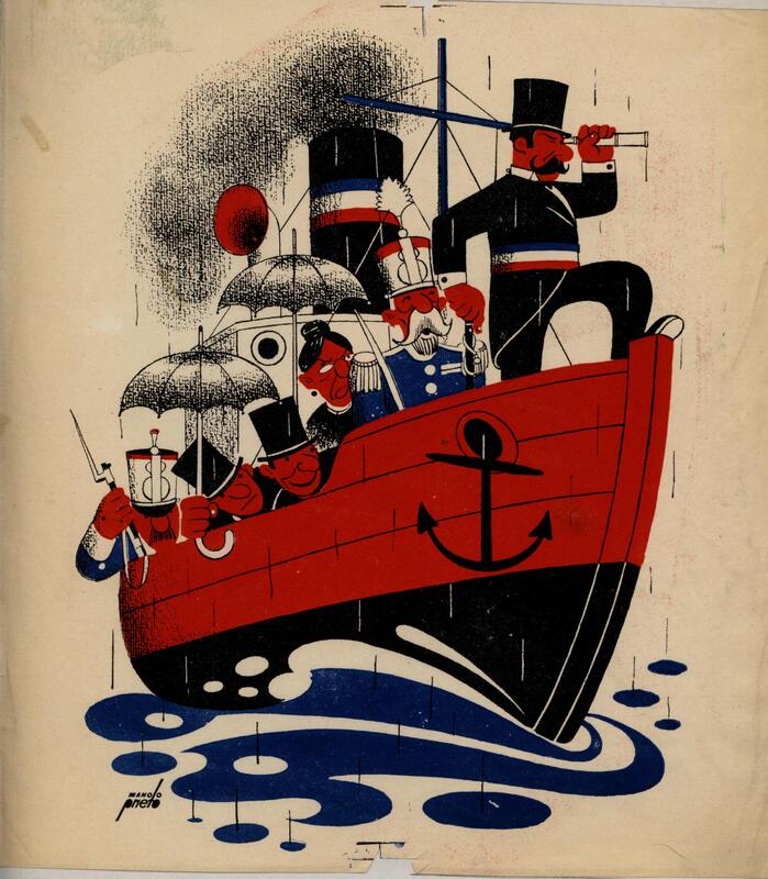 En un barco negro y rojo con grandes chimeneas de las que se desprende un humo negro se ven numerosos pasajeros con paraguas y trajes negros mirando por la borda. En la proa del barco un hombre mira por un catalejo. El barco navega sobre aguas blancas y azules. Es una composición firmada.Prueba de imprenta. Ilustración realizada para la revista semanal de Novelas y Cuentos. Titulo: Port Tarascón ( Ultimas aventuras del ilustre Tartarin. ); Autor: Alfonso Daudet; nº public.: 939; Fecha: 08-05-49; Tomo: 11; boc. 368.