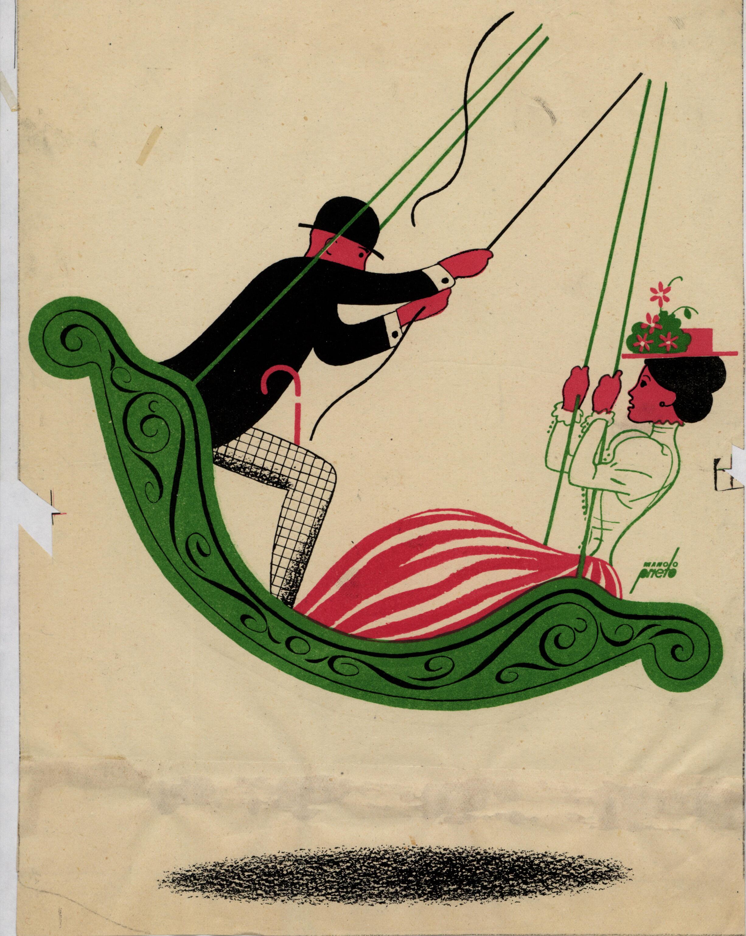 Un hombre y una mujer, sentados cada uno en un extremo del balancín verde, se balancean. Él lleva un traje negro y gris y sombrero mientras que ella lleva una falda blanca con rayas rosas y un corpiño verde, también lleva un sombrero de flores sobre su cabeza. Las dos figuras se hallan de perfil. La composición está firmada.Prueba de imprenta. Ilustración realizada para la revista semanal de Novelas y Cuentos. Titulo: Autor: Nº publicado: Fecha: Tomo NC.