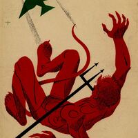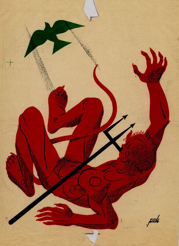 En este dibujo firmado se encuentran dos figuras: un pájaro verde en la parte superior y en la parte inferior un demonio rojo con su tridente negro cayendo de espalda.Prueba de imprenta. Ilustración realizada para la revista semanal Novelas y Cuentos. Titulo: El arrepentimiento. Autor: George Eliot. Nº publicado: 958. Fecha: 13-09-1949. Tomo NC. 17.
