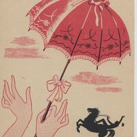 En este dibujo firmado destacan, en el lado derecho de la composición, unas manos femeninas en tonos rosas cogiendo una sombrilla abierta con lazos y rosa. En segundo plano se vislumbra una figura, de color negro, de un hombre cayendo de un caballo.Prueba de imprenta. Ilustración realizada para la revista semanal de Novelas y Cuentos. Titulo: El jardín del Rey. Autor: P. V. Margueritte. Nº publicado: 815. Fecha: 22-12-1946. Tomo NC. 7