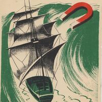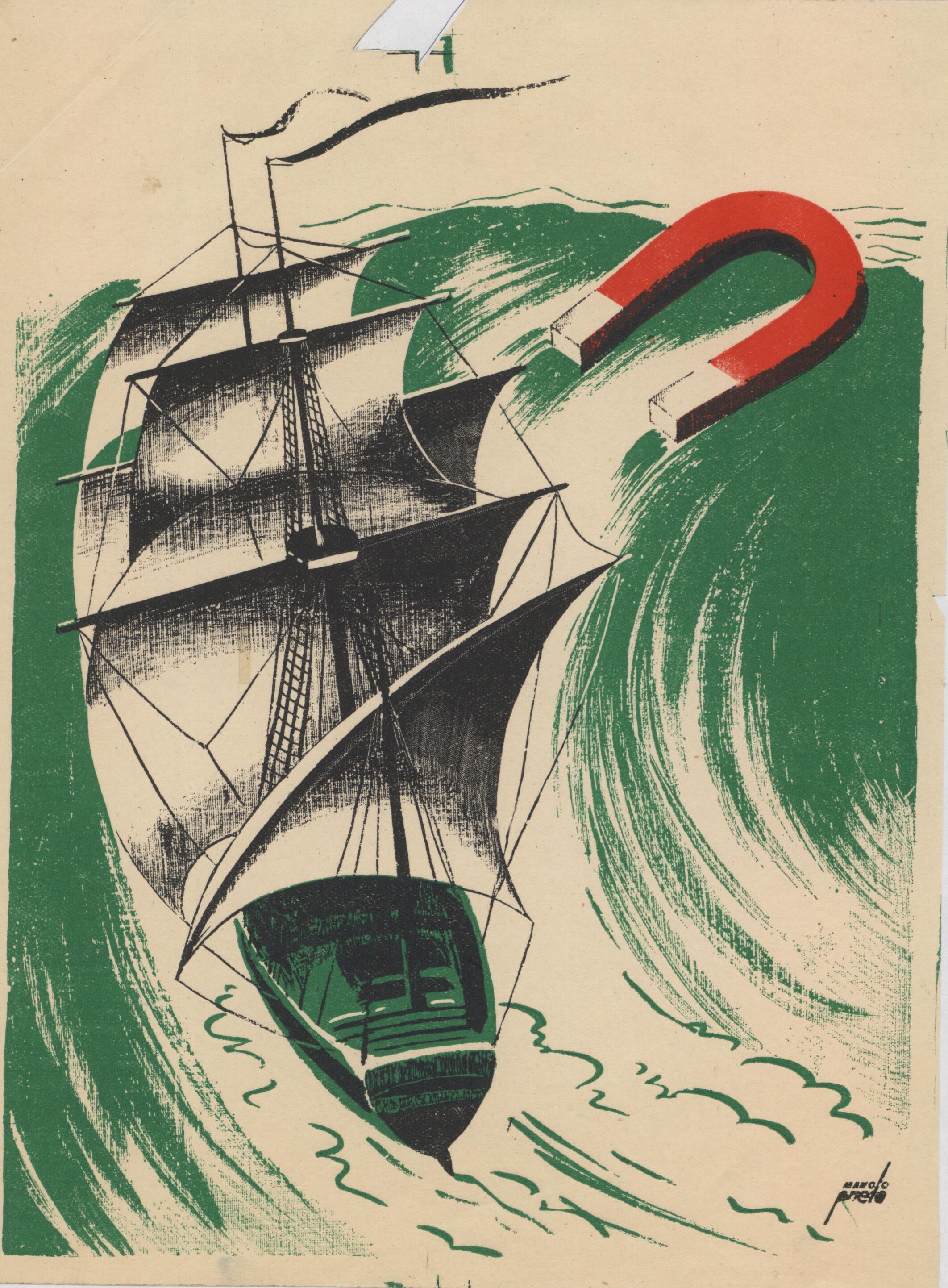 - En este dibujo firmado destaca un barco con velas blancas enfrentándose a la violencia de las aguas verdes del mar en plena tempestad. En el dibujo destaca también la figura de un imán blanco y rojo.Prueba de imprenta. Ilustración realizada para la revista semanal de Novelas y Cuentos. Titulo: Autor: Nº publicado: Fecha: Tomo NC.