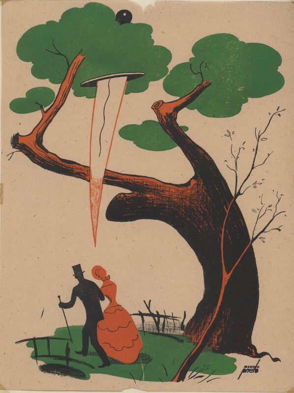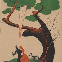 En esta extraña composición firmada por su autor se encuentran tres elementos: una pareja de paseantes, ella con el vestido y sombrero naranja y él con el traje y sombrero negro; un árbol de gran tronco y frondosa copa verde; y, por último, un cuchillo entre la frondosidad del árbol.Prueba de imprenta. Ilustración realizada para la revista semanal de Novelas y Cuentos. Titulo: Autor: Nº publicado: Fecha: Tomo NC.