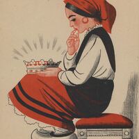 Sentada sobre un banco rojo se encuentra una muchacha de perfil observando una corona que sostiene sobre sus piernas. Lleva una falda roja con rayas negras, camisa blanca, un chal negro sobre su espalda, un pañuelo rojo sobre su pelo negro y en los pies unos zuecos blancos. El dibujo está firmado.Prueba de imprenta. Ilustración realizada para la revista semanal de Novelas y Cuentos. Titulo: Autor: Nº publicado: Fecha: Tomo NC.