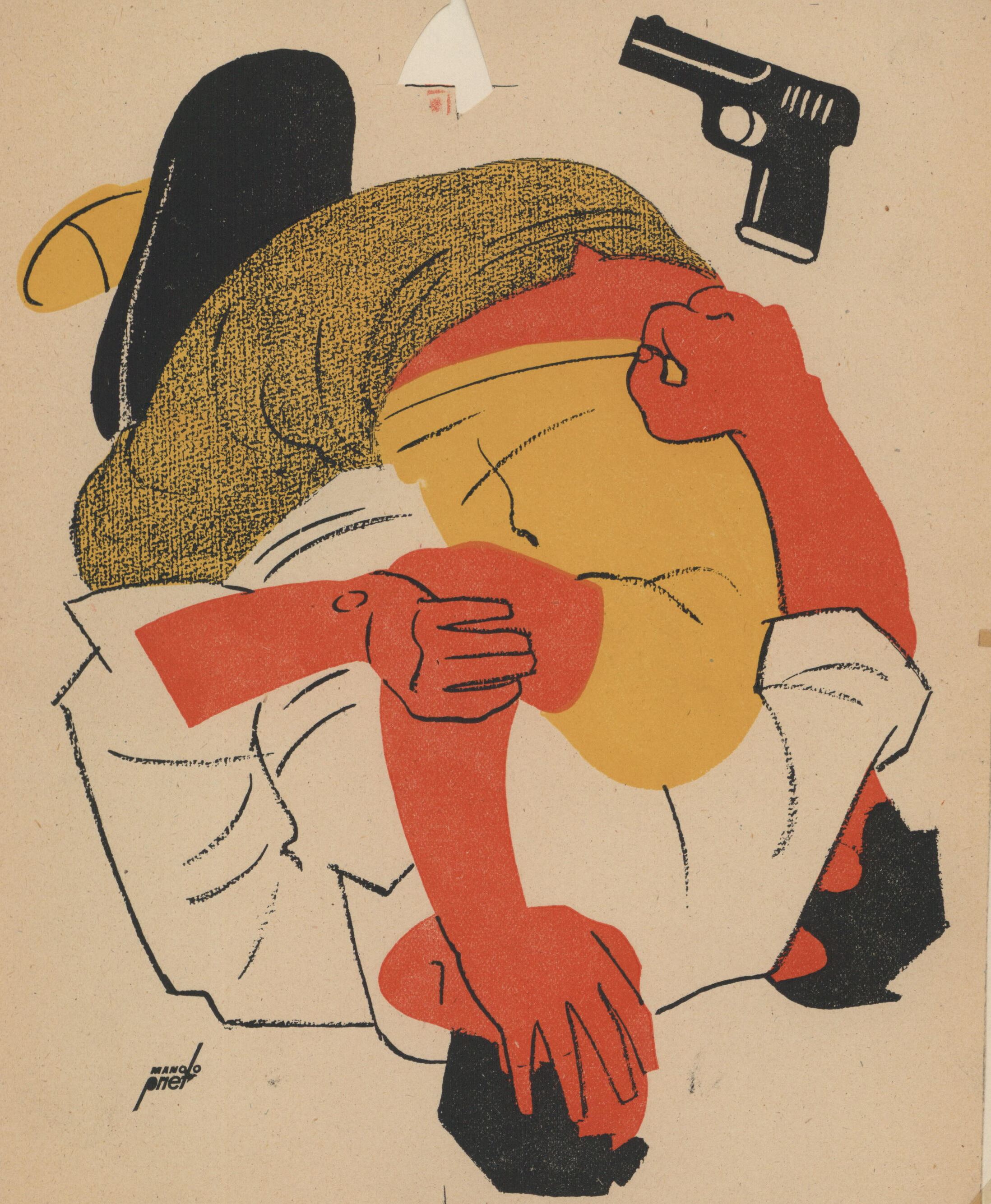 En esta composición firmada destacan dos hombres que ruedan por el suelo mientras se agarran en una violenta pelea. Ambos tienen el pelo negro. uno lleva una camisa amarilla y el otro blanca. Una pistola se destaca en la parte superior del dibujo.Prueba de imprenta. Ilustración realizada para la revista semanal de Novelas y Cuentos. Titulo: tras la alambrada. Autor: Luke Allan. Nº publicado: 929. Fecha: 27-02-1949. Tomo NC. 20.