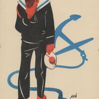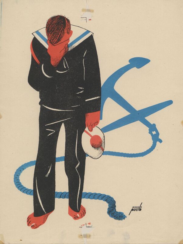 Un marinero en el centro de la escena, vestido con un traje negro, se lamenta escondiendo su rostro en una mano mientras la otra sostiene un sombrero blanco y rojo. Por detrás de la figura se muestra un ancla azul amarrada a una cuerda del mimo color la composición está firmada.Prueba de imprenta. Ilustración realizada para la revista semanal de Novelas y Cuentos. Titulo: El abandonado. Autor: René Bazín. Nº publicado: 960. Fecha: 21-10-1949. Tomo NC.: 6.