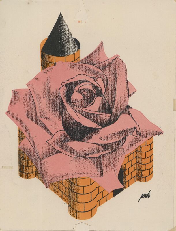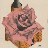 - Sobre un castillo de paredes marrones y tejado negro se encuentra una gran rosa de bellísimos pétalos. La composición está firmada.Prueba de imprenta. Ilustración realizada para la revista semanal de Novelas y Cuentos. Titulo: AltezaReal; Autor:tomás Mann; Nº de orden: 980; Fecha: 19-02-50; Tomo NC.: --;