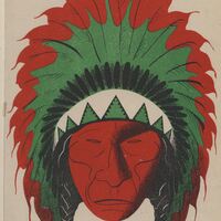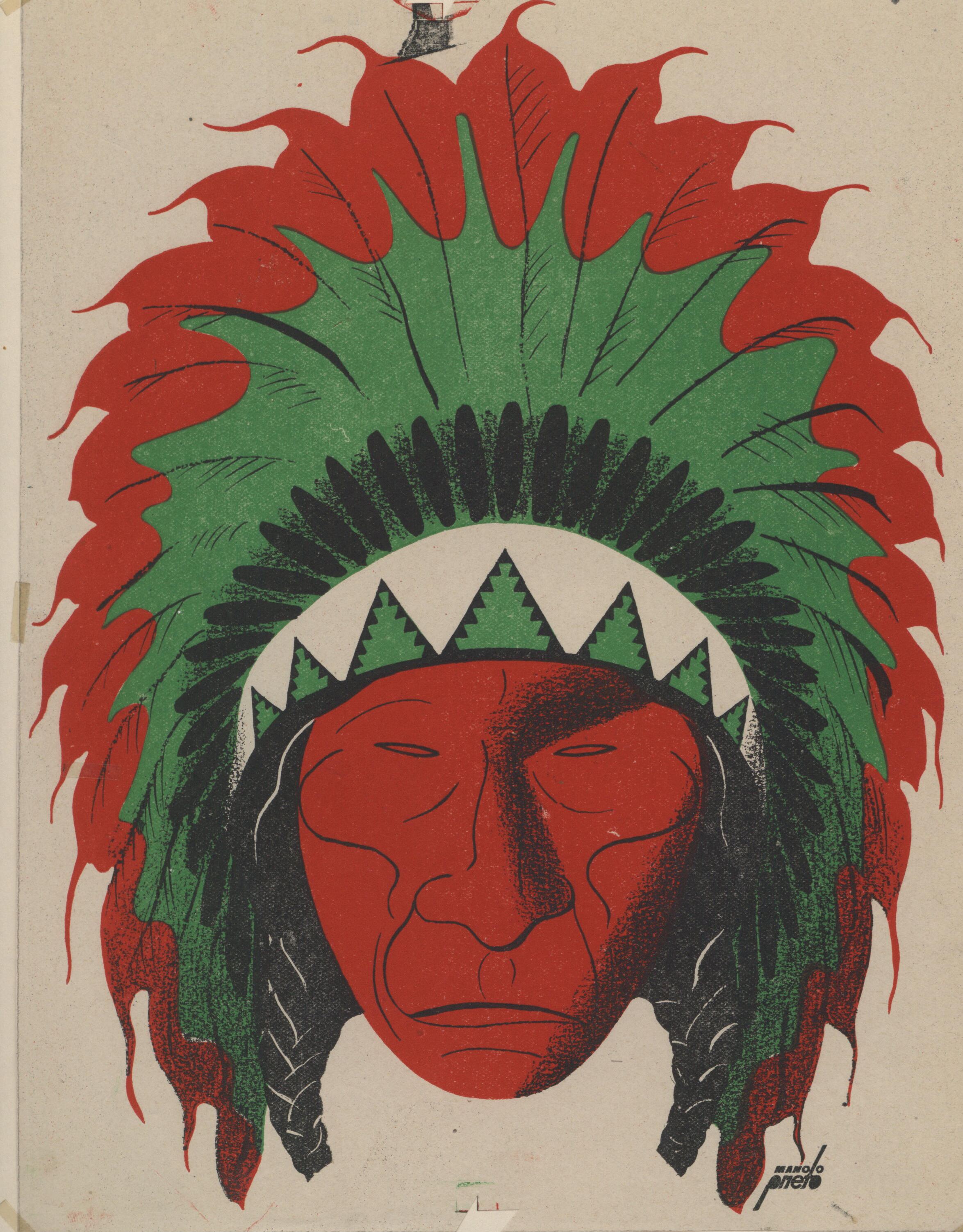 - En este dibujo destaca en el centro el rostro de un indio de semblante serio con su cabeza adornada por una corona de plumas verdes y rojas, donde también destaca el color blanco.Prueba de imprenta. Ilustración realizada para la revista semanal de Novelas y Cuentos. Titulo: Autor: Nº publicado: Fecha: Tomo NC.: