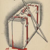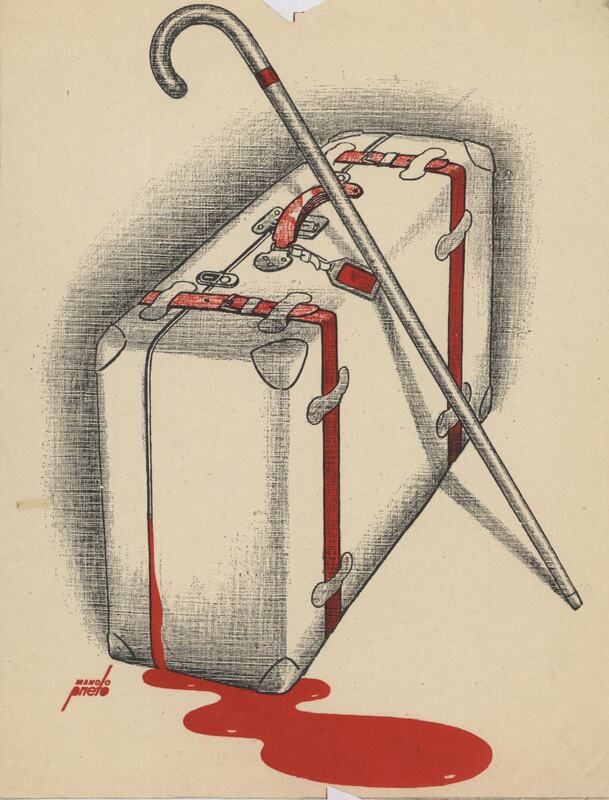 Dos elementos configuran este dibujo firmado: una maleta blanca y roja y un bastón también blanco apoyado a ella. Al lado de la maleta se ve una macha de color rojo.Prueba de imprenta. Ilustración realizada para la revista semanal de Novelas y Cuentos. Titulo: Una aventura trágica; Autor: Alberto Boissiere; Nº publicado: 871; Fecha: 18-01-48; Tomo NC.: 05; Boceto No.