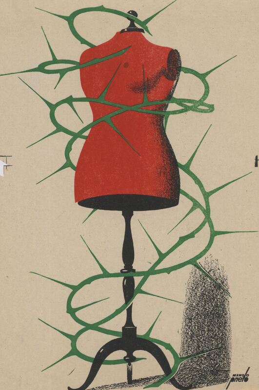 Un modelo rojo sobre un palo negro con tres piernas en su parte inferior se encuentra en el centro de esta composición firmada. La figura es cubierta por una línea en forma de espiral de la que sobresalen grandes pinchos.Prueba de imprenta. Ilustración realizada para la revista semanal de Novelas y Cuentos. Titulo: El marido de la modista. Autor: Henri Duvernois. Nº publicado: 903. Fecha: 29-08-1948. Tomo NC.: 6.