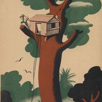 Sobre un árbol de tronco muy largo y verdes hojas se halla construida una casa de madera. Sobre una rama y al lado de la casa se ve la diminuta figura de un hombre. Alrededor de este árbol se puede ver más vegetación. Está presente la firma del pintor en el dibujoPrueba de imprenta. Ilustración realizada para la revista semanal Novelas y Cuentos. Titulo: Autor: Nº publicado: Fecha: Tomo NC.: