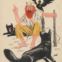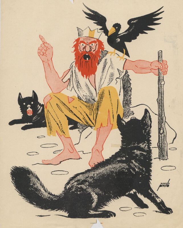 En este dibujo firmado destaca la imagen de un hombre pobremente vestido con un pantalón amarillo y camisa blanca. Sobre su cabeza lleva una corona. A su alrededor se ven dos perros negros y sobre su hombro se encuentra posado un cuervo. El hombre habla con los animales gesticulando con su mano derecha mientras que con la izquierda sostiene un palo. En su rostro sobresale una espesa barba roja.Prueba de imprenta. Ilustración realizada para la revista semanal de Novelas y Cuentos. Titulo: La invasión o El Loco Yegof. Autor: Eckmann Chatrian. Nº publicado: 942. Fecha: 29-05-1949. Tomo NC.: 3.