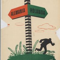 En el dibujo firmado destaca una señal en la que está escrito Alemania sobre un fondo rojo, hacia la derecha, y Holanda sobre un fondo verde, hacia la izquierda. El palo de la señalización es a rayas negras y blancas. Un hombre corre en un segundo plano.Prueba de imprenta. Ilustración realizada para la revista semanal de Novelas y Cuentos. Titulo: La fiera en acecho. Autor: Valentine Willians. Nº publicado: 946. Fecha: 26-06-1949. Tomo NC.: 3.