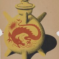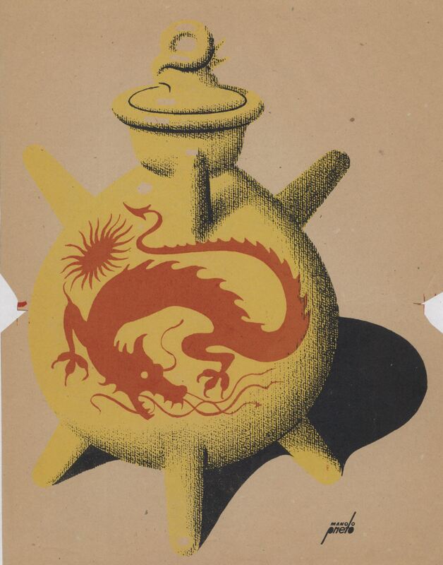 Un objeto se encuentra en el centro de este dibujo firmado. Se sostiene sobre tres patas y en su parte superior surgen tres brazos. En su cuerpo redondo tiene dibujado un dragón rojo.Prueba de imprenta. Ilustración realizada para la revista semanal de Novelas y Cuentos. Titulo: El jarrón amarillo. Autor: John P. Marquand. Nº publicado: 938. Fecha: 01-05-1949. Tomo NC.: 20.