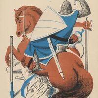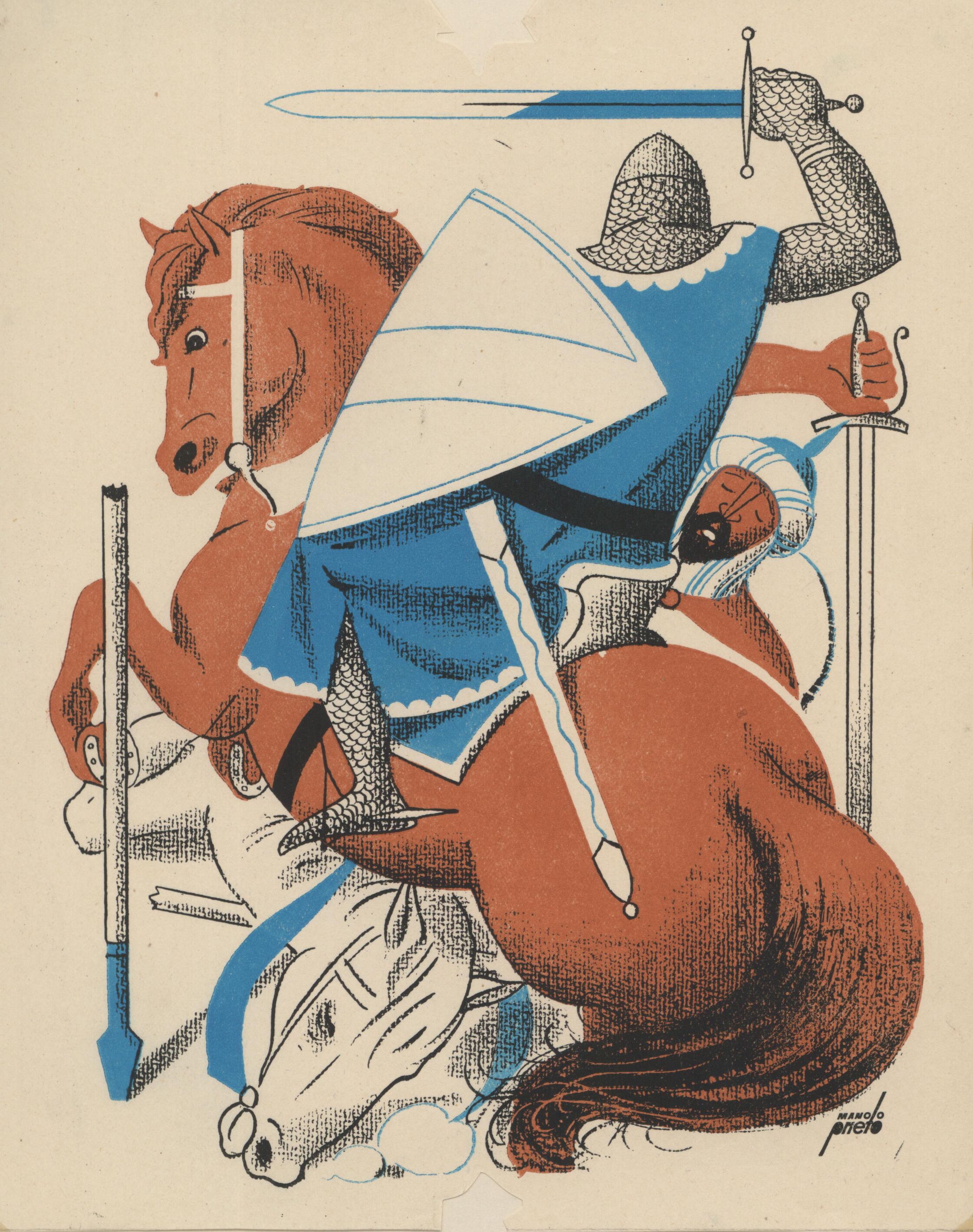 Un caballero cristiano y un moro luchan en un feroz combate. El caballo del cristiano es marrón mientras que el del moro es blanco. El caballero cristiano, de espalda, lleva un traje en el que destaca el color azul y el gris, además de la espada y el escudo. La composición está firmada.Prueba de imprenta. Ilustración realizada para la revista semanal de Novelas y Cuentos. Titulo: El romance de Rolando. Autor: Anónimo. Nº publicado: 951. Fecha: 31-07-1949. Tomo NC.: 19.