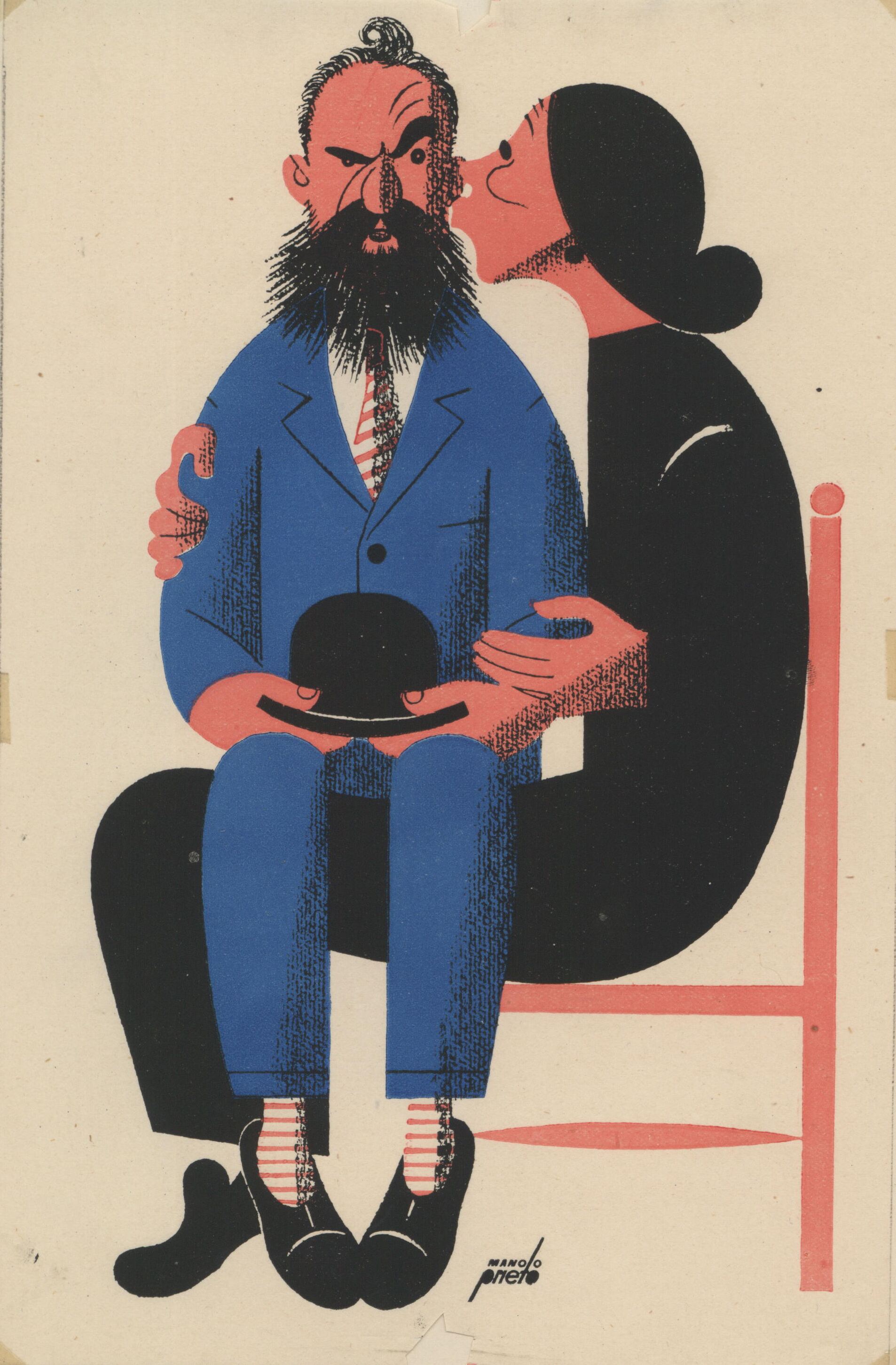 Una mujer sentada sobre una silla rosa, con un traje negro y de perfil besa la mejilla de un hombre barbudo que está sentado sobre su regazo y en una posición frontal. Su traje es azul y sujeta en sus manos un sombrero negro. En la composición esta presente la firma del pintor.Prueba de imprenta. Ilustración realizada para la revista semanal de Novelas y Cuentos. Titulo: Autor: Nº publicado: Fecha: Tomo NC.