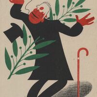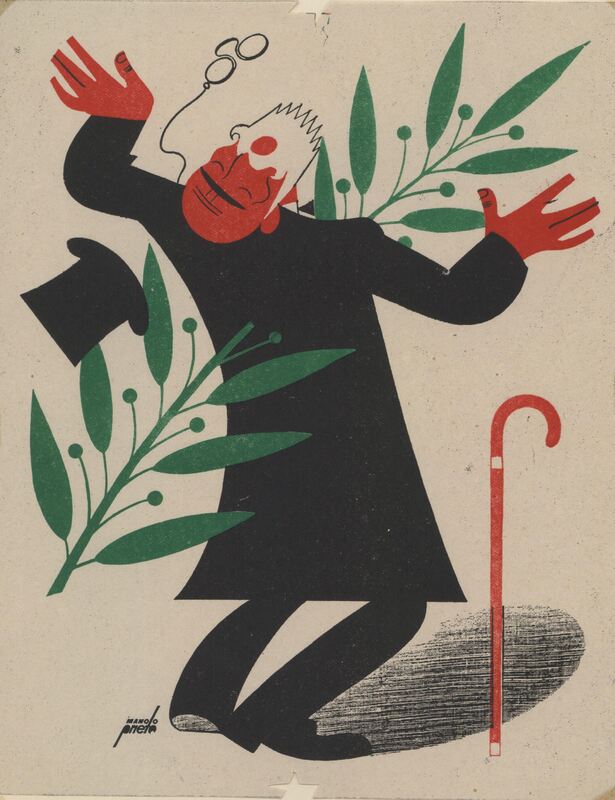 Un hombre con el traje negro es atravesado por una gran rama de hojas verdes. El sombrero vuela por el aire lo mismo que su bastón y las gafas. El hombre es calvo pero con una espesa barba blanca en su rostro.Prueba de imprenta. Ilustración realizada para la revista semanal de Novelas y Cuentos. Titulo: Autor: Nº publicado: Fecha: Tomo NC.