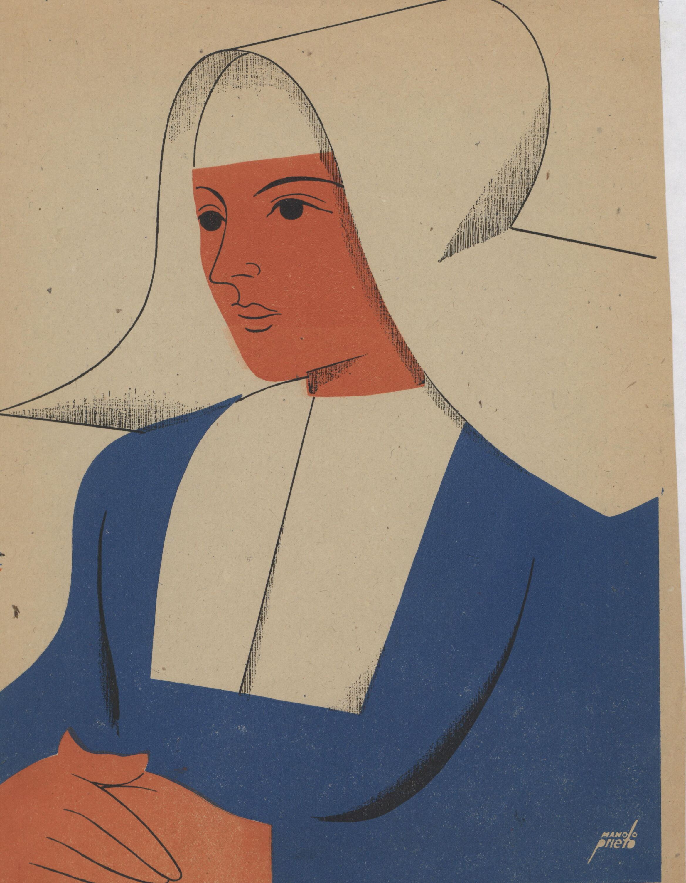 Una monja se ha representado en este dibujo firmado. Sobre su cabeza lleva un gorro blanco y en su vestido destaca el blanco y el azul. La mujer junta las manos en una actitud de piedad.Prueba de imprenta. Ilustración realizada para la revista semanal de Novelas y Cuentos. Titulo: Sor Clemencia. Autor: Enrique Pérez Escrich. Nº publicado (264) pero le corresponde el 864. Fecha: 30-11-1947. Tomo NC. 11.