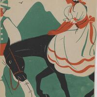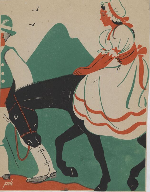 En este dibujo firmado un hombre, del que se ve la mitad de su cuerpo, conduce un burro negro que lleva sobre su lomo a una mujer con el vestido blanco con rayas naranjas y una toca sobre su cabeza. En el fondo del dibujo se adivina un paisaje montañoso muy verde.Prueba de imprenta. Ilustración realizada para la revista semanal de Novelas y Cuentos. Titulo: Autor: Nº publicado: Fecha: Tomo NC.