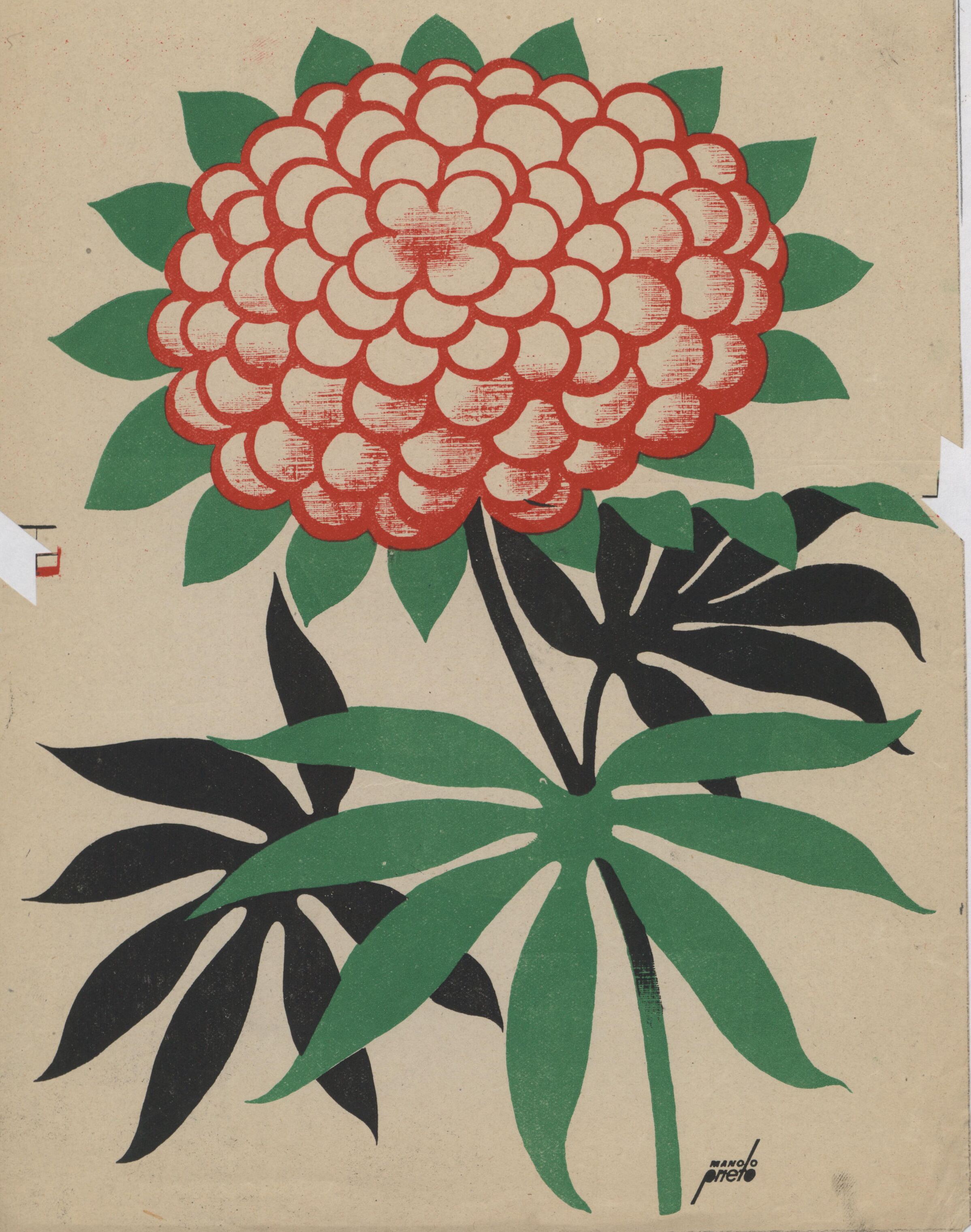 - En el centro de esta composición firmada destaca una gran flor con los pétalos pequeños, rojos y blancos. En su tallo muy fino crecen hojas verdes.Prueba de imprenta. Ilustración realizada para la revista semanal de Novelas y Cuentos. Titulo: Autor: Nº de publicado: Fecha: Tomo NC.