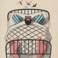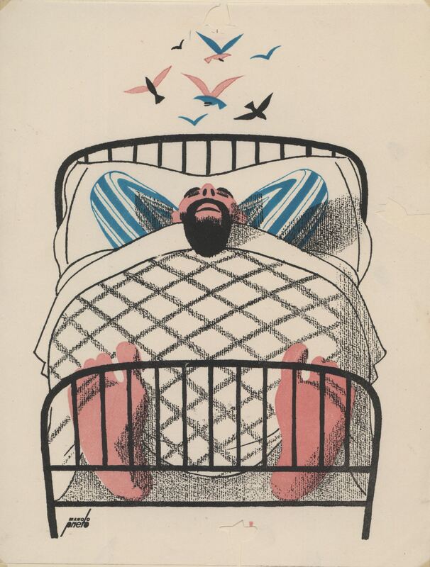 Un hombre barbudo que duerme, con un pijama blanco a rayas azules, en una cama con sábanas blancas con los pies descubiertos y los brazos bajo la cabeza se ha representado en este dibujo firmado. Sobre su cabeza vuelan algunos pájaros.Prueba de imprenta. Ilustración realizada para la revista semanal de Novelas y Cuentos. Titulo: Inquietud e indecisión. Autor: Iván Goncharov. Nº de Orden: 979. Fecha: 12-02-1950. Tomo NC.: 23.
