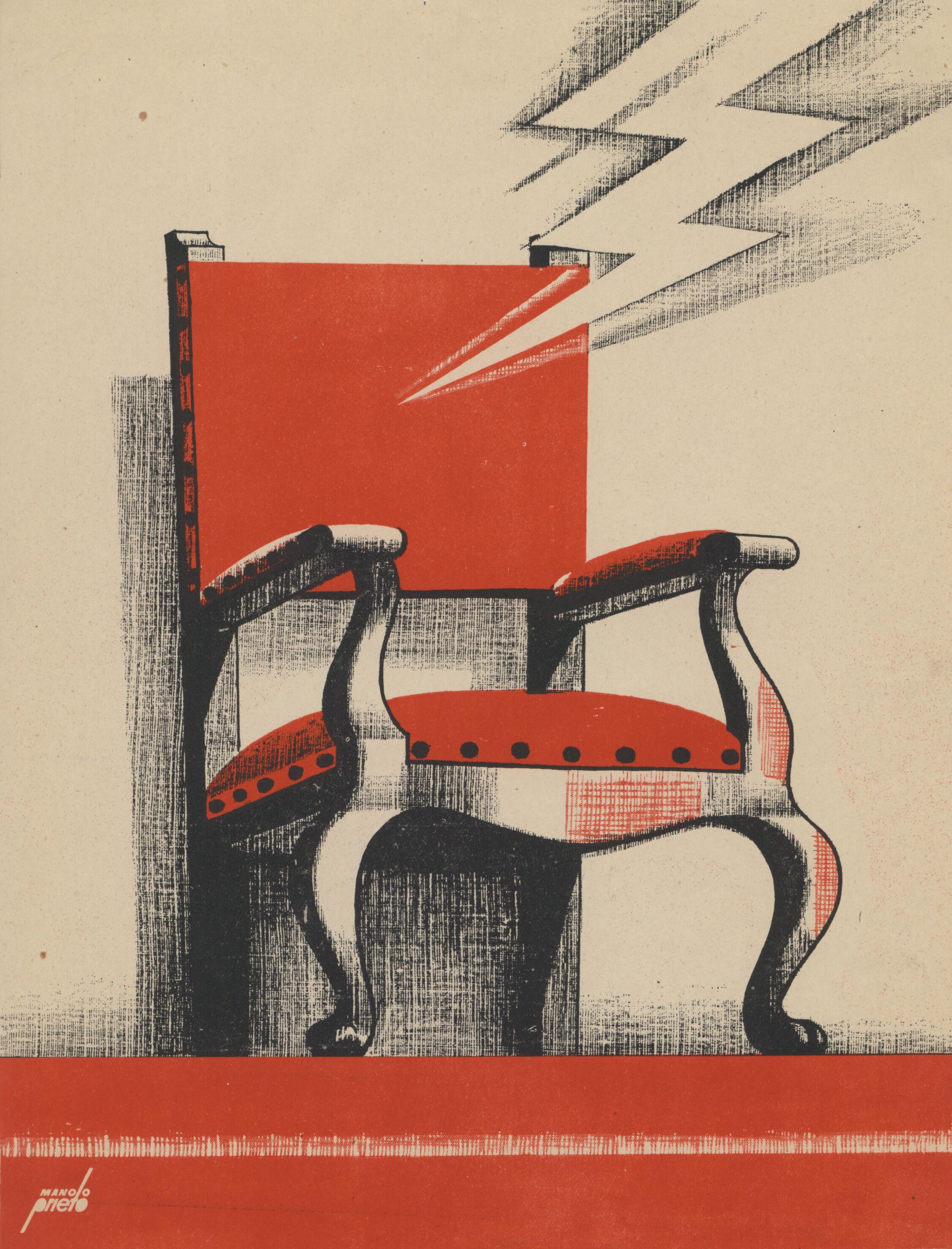 - Sobre una superficie roja se ha realizado en esta composición firmada una silla también roja. En el dibujo se puede vislumbrar un gran rayo blanco.Prueba de imprenta. Ilustración realizada para la revista semanal de Novelas y Cuentos. Titulo: Autor: Nº publicado: Fecha: Tomo NC.: