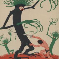 Un hombre lucha ferozmente contra unos árboles peculiares al que se les ha pintado con atributos humanos como brazos, en los que sobresalen grandes garras, y ojos. Dos árboles son verdes y el que se encuentra en primer término es negro. Está presente la firma del pintor en la composición.Prueba de imprenta. iñustracióntración realizada para la revista semanal de Novelas y Cuentos. Titulo: Los dioses de Marte;Autor:Edgar Rice Burroughs; Nº publicado: 825 Fecha: 02/03/47Tomo NC.: