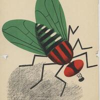 En el centro de este dibujo se ha representado la imagen de una mosca. Sus alas son verdes y su cuerpo es negro en el que destacan rayas rojas y también algunas verdes. En su cabeza destacan dos grandes ojos rojos. Seis patas muy finas y negras componen sus extremidades.Prueba de imprenta. Ilustración realizada para la revista literaria Novelas y Cuentos. Titulo: La Reina misteriosa. Autor: Fergus Hume. Nº publicado: 876. Fecha: 22-02-1948. Tomo NC. 8.