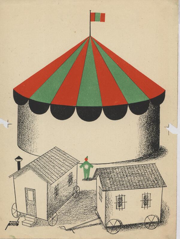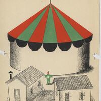 En esta composición firmada destaca una tienda de circo blanca con un tejadillo en el que destacan los colores verde y rojo. Al lado de la tienda se encuentran dos casotas, también blancas. Sobre el tejadillo ondea una bandera.Prueba de imprenta. Ilustración realizada para la revista semanal de Novelas y Cuentos. Titulo: La cruz luminosa. Autor: Juana de Coulomb. Nº publicado: 881. Fecha: 29-03-1948. Tomo NC. 4.