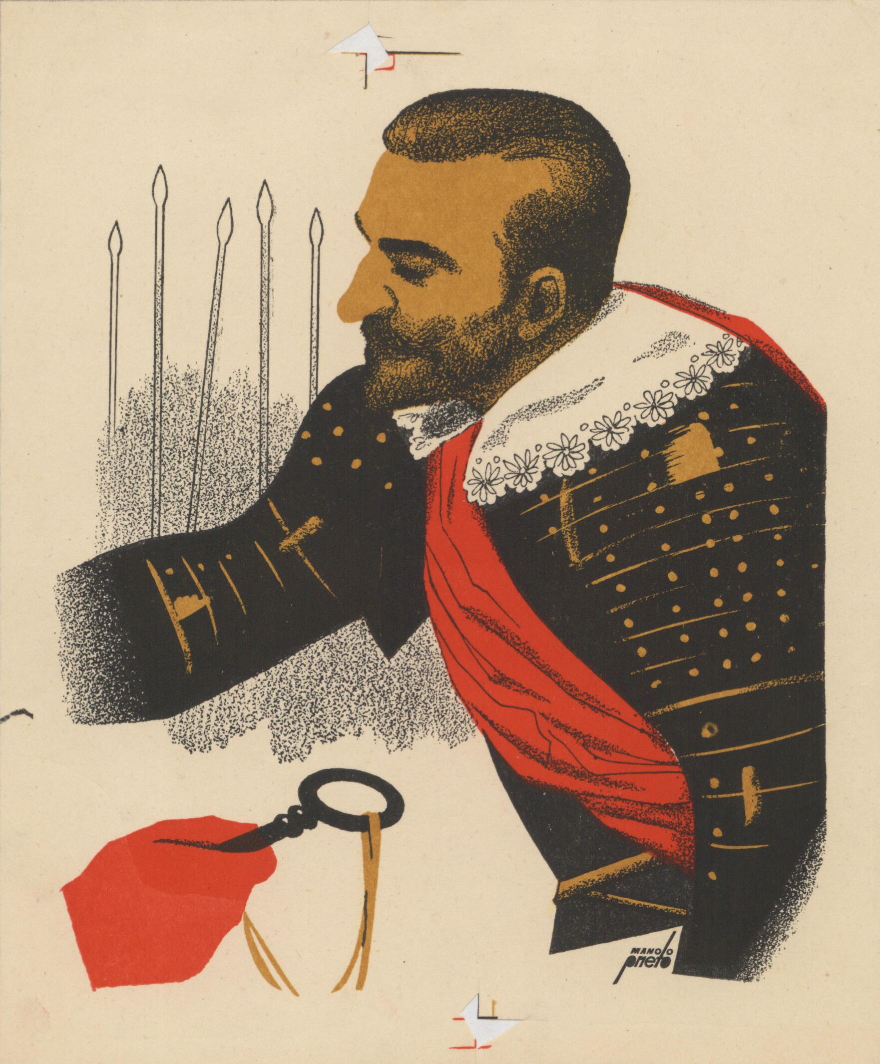En este dibujo firmado se representa un detalle del famoso episodio de la rendición de Breda. En él un personaje con un traje negro, con una banda roja sobre su pecho y una gola en el cuello acepta una llave que le entregan. En su rostro de semblante pacífico crece una barba castaña. Por detrás de esta figura se adivinan algunas lanzas grises.Prueba de imprenta. Ilustración realizada para la revista semanal de Novelas y cuentos. Titulo: Autor: Nº publicado: Fecha: Tomo NC.