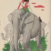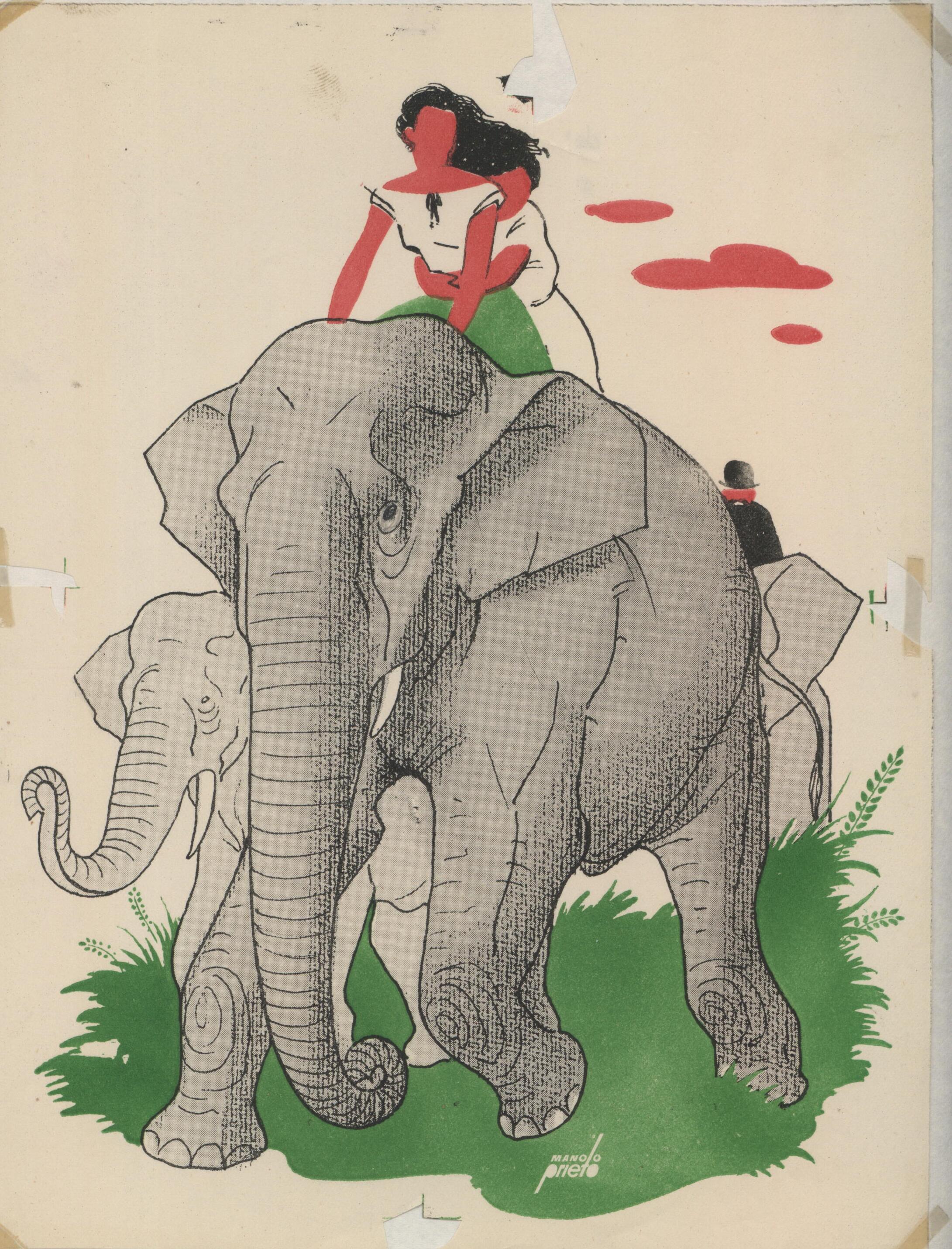 Varios elefantes grises se muestran en esta composición firmada. En primer plano destaca un elefante que lleva sobre su lomo a dos personas, un chico y una chica. El color verde de la hierba también toma parte en el dibujo.Prueba de imprenta. Ilustración realizado para la revista semanal de Novelas y Cuentos. Titulo: Autor: Nº publicado: Fecha: Tomo NC.