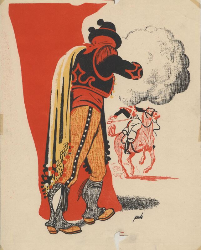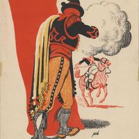 Un hombre con un traje en el que destacan el negro, el rojo y el naranja de espalda y escondido detrás de un tronco rojo de un árbol dispara, causando una humareda blanca y gris, a un jinete que se aproxima asesinándole. En el dibujo puede apreciarse la firma del pintor.Prueba de imprenta. Ilustración realizada para la revista semanal de Novelas y Cuentos. Titulo: Autor: Nº publicado: Fecha: Tomo NC.