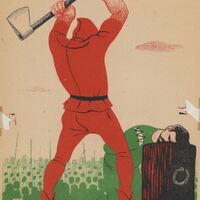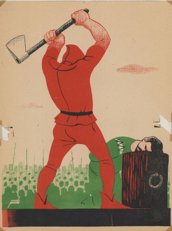 Un verdugo con el traje rojo, de espalda y con el hacha en ristre dispone a llevar a cabo la ejecución contra el hombre que apoya su cabeza sobre el tronco. Dicho hombre lleva un traje verde. Y detrás se puede adivinar una gran multitud que asiste al espectáculo. Se puede vislumbrar la firma del pintor.Prueba de imprenta. Ilustración realizada para la revista semanal de Novelas y Cuentos. Titulo: El Trovador. Autor: Ricardo Ortega y Frías. Nº publicado: 928. Fecha: 20-02-1949. Tomo NC. 10.