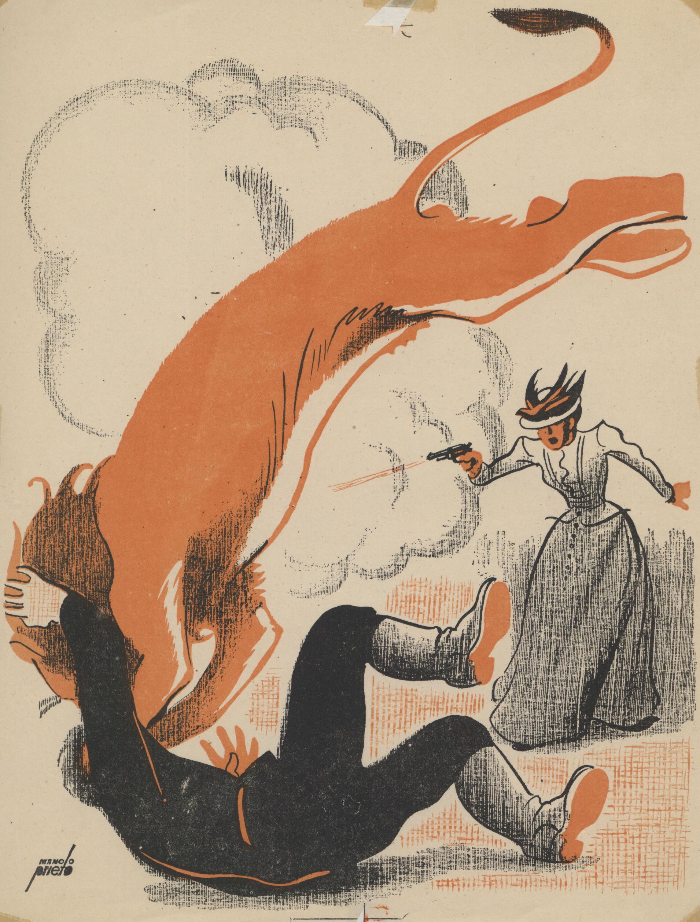 Una mujer que surge en segundo plano y al ver que un hombre es atacado por un león marrón coge una pistola que dispara contra el animal. Dicha mujer lleva un vestido largo gris y un sombrero sobre su cabeza. El hombre lleva un traje negro. En el dibujo se aprecia la firma del pintor.Ilustración realizada para la revista semanal de Novelas y cuentos. Titulo: Clovis Dardentor; Autor: Julio Verne;Nº publicado: 812; Fecha:01/12/46; Tomo NC.:No