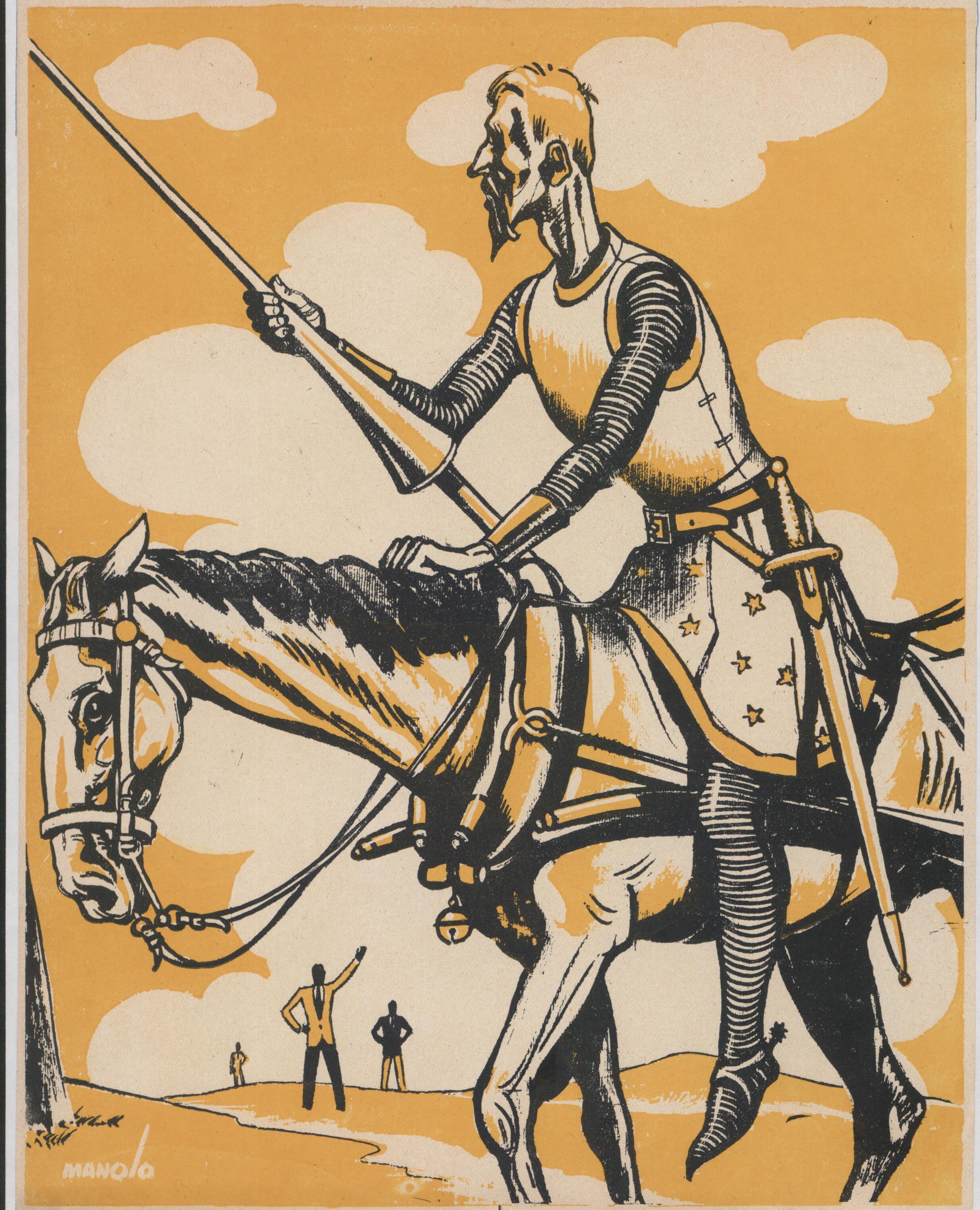 El caballero Don Quijote de La Mancha está representado en el centro de este dibujo en el que también está presente la firma del pintor. El caballero español va sobre un caballo y sosteniendo su lanza. En segundo plano unas figuras le saludan. Destacan los colores amarillo y blanco en toda la composición.Prueba de imprenta. Ilustración realizada para la revista semanal Novelas y Cuentos. Titulo: Autor: Nº publicado: Fecha: Tomo NC.: