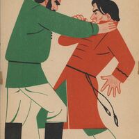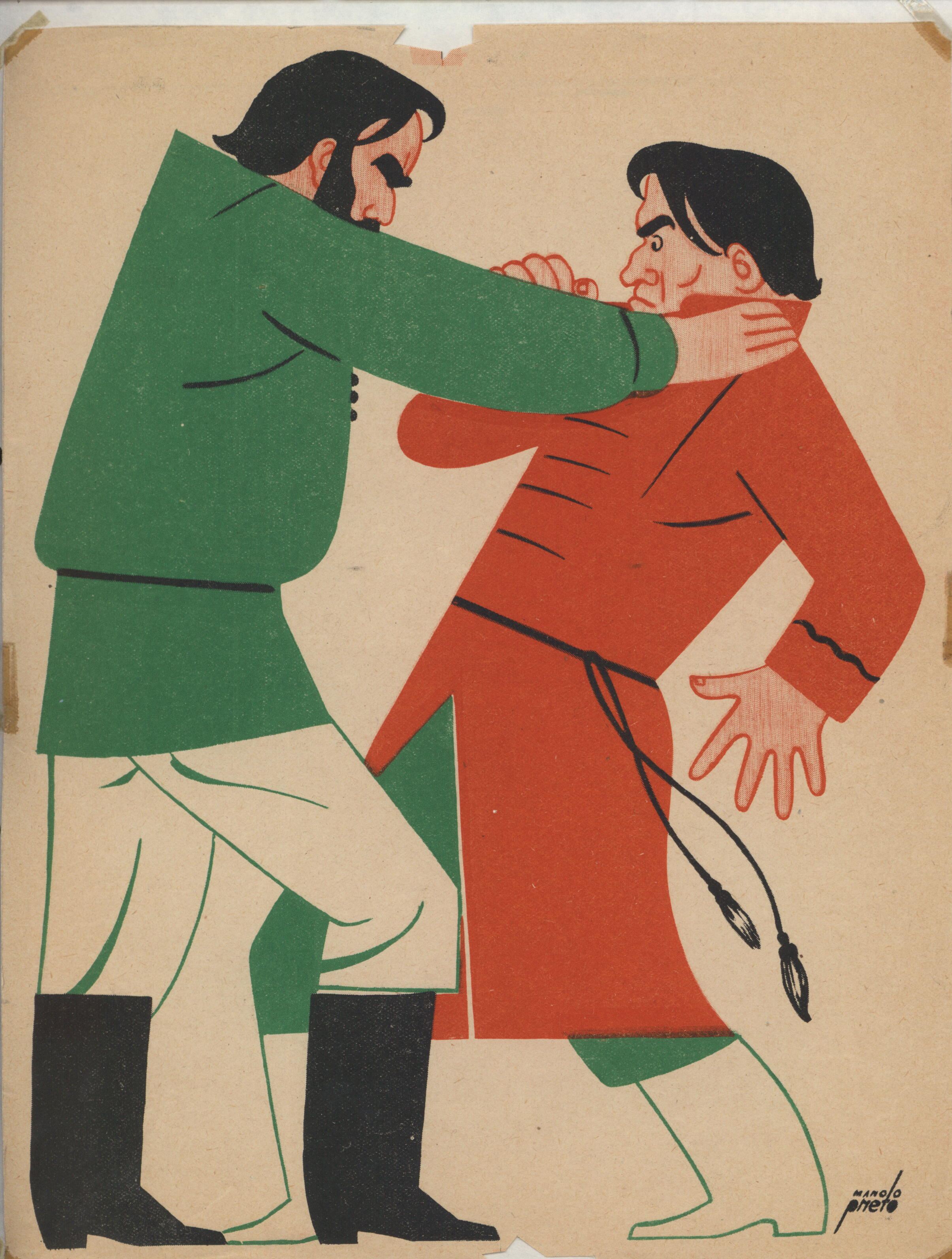 - Dos hombres que se encuentran de perfil en esta composición firmada se pelean. El de la derecha lleva un pantalón blanco y una camiseta verde y el de la izquierda un pantalón verde y una chaquete roja.Prueba de imprenta. Ilustración realizada para la revista semanal de Novelas y Cuentos. Titulo: Autor: Nº publicado: Fecha: Tomo NC.: