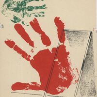 - Sobre un fondo claro destacan las huellas de dos manos: una roja y otra verde. También destaca en el dibujo firmado una figura geométrica perece un cristal rectángulo apoyado en la pared.Prueba de imprenta. Ilustración realizada para la revista semanal Novelas y Cuentos. Titulo: Autor: Nº publicado: Fecha: Tomo NC.: