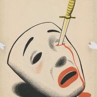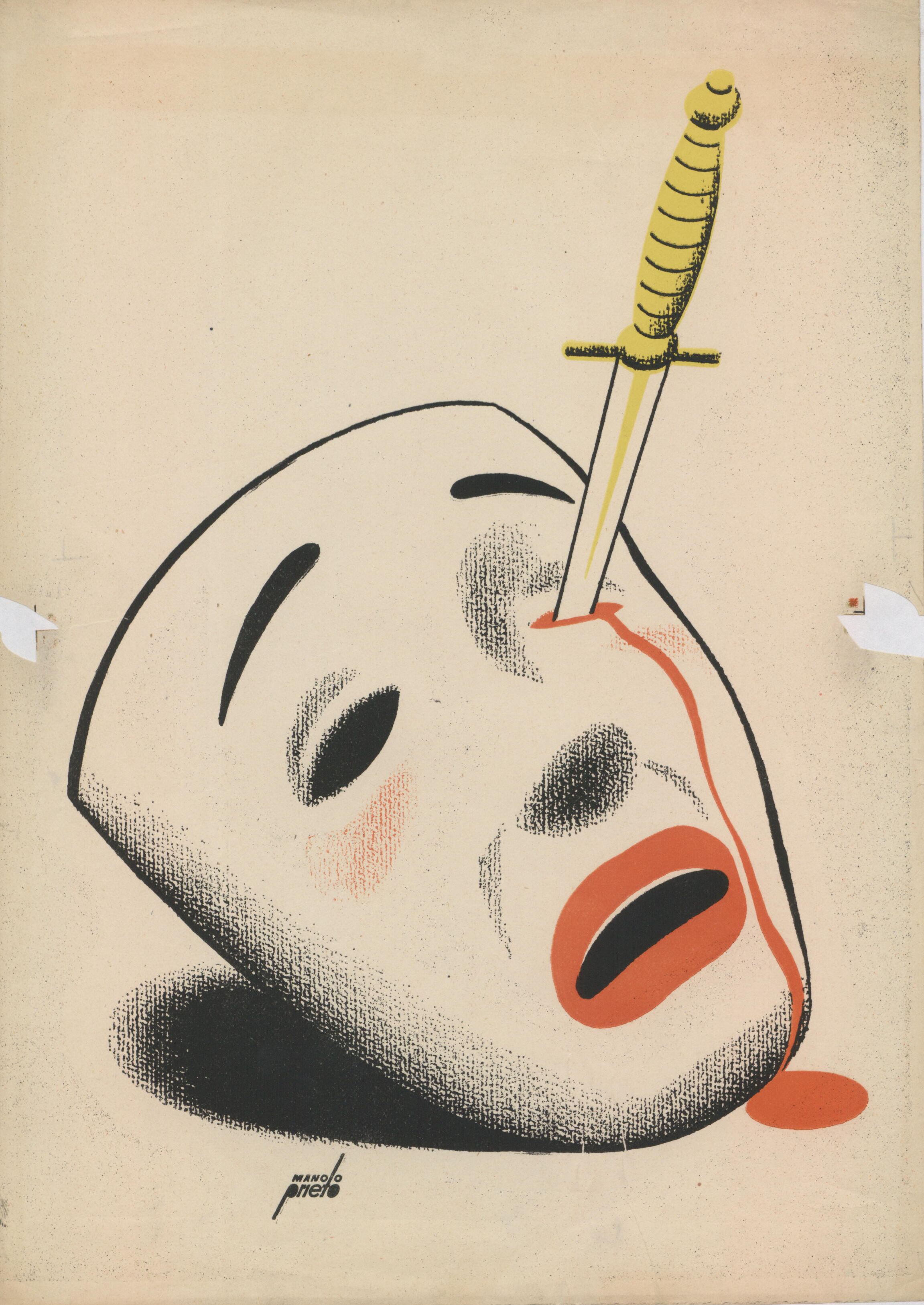 Sobre un fondo claro y en el dibujo firmado destaca la imagen de una máscara blanca con una gran boca roja, abierta y con una expresión dolorosa mientras un puñal está clavado en su ojo izquierdo del que además se desprende la sangre provocada por la herida.Prueba de imprenta. Ilustración realizada para la revista semanal Novelas y Cuentos. Titulo: La montaña. Autor: N. S. Lieskoy. Nº publicado: 961. Fecha: 09-10-1949.. Tomo NC.: 8.