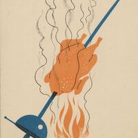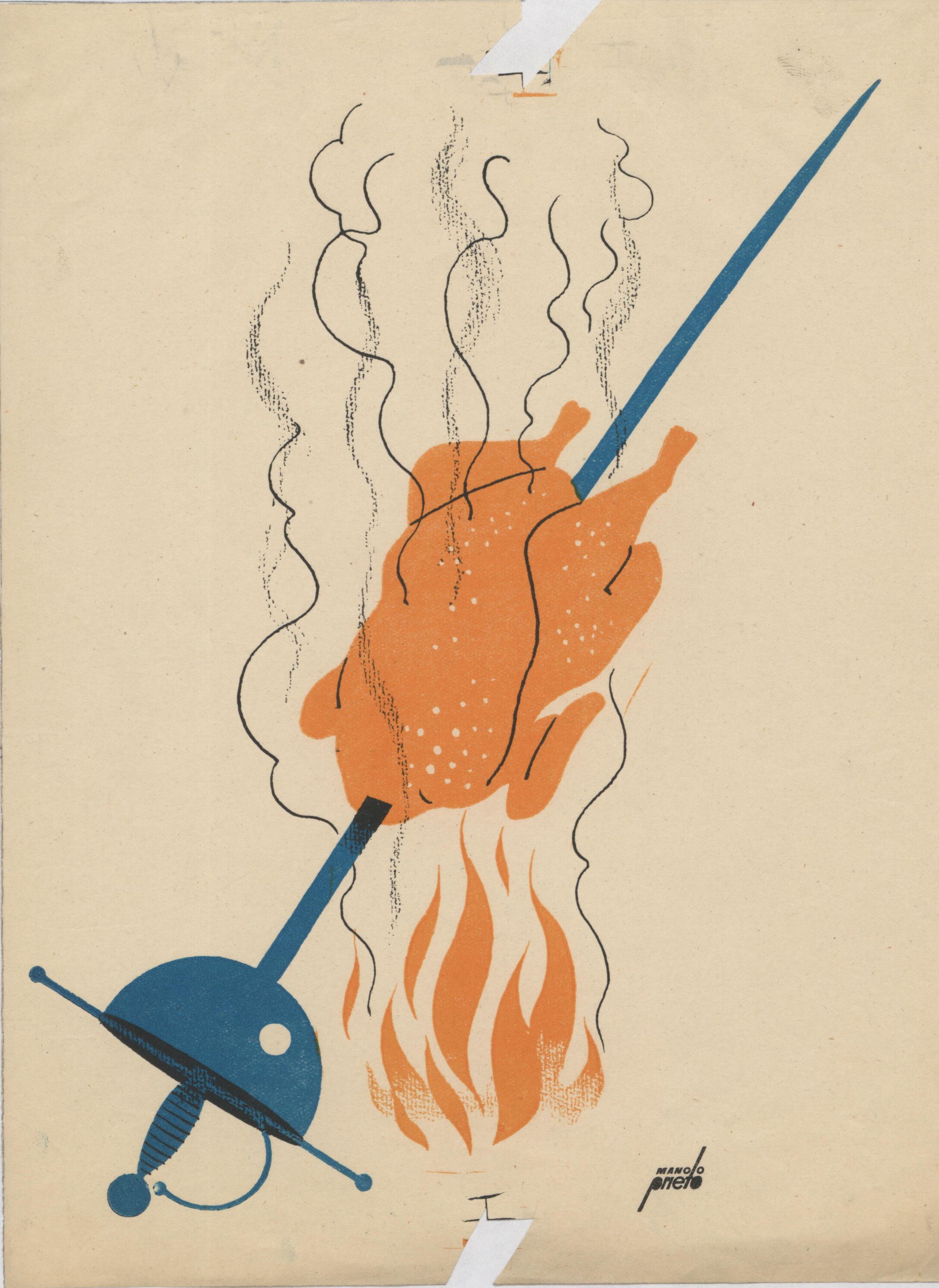 Un pollo espetado en una espada azul está dispuesto para asarse sobre una hoguera de llamas rojizas de la que se desprende humo gris. La composición está firmada.Prueba de imprenta. Ilustración realizada para la revista semanal Nov elas y cuentos. Titulo: Mi tío Benjamín. Autor: Claudio Tiller. Nº publicado: 957. Fecha: 11-09-1949. Tomo NC.: 11.