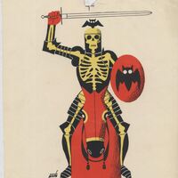 Sobre un caballo cubierto con una manta roja y del que se ven sus ojos se aprecia la figura de un esqueleto con los huesos amarillos blandiendo una espada en su mano derecha mientras que con su mano izquierda sostiene un escudo rojo sobre el que hay dibujado en negro un murciélago. El dibujo está firmado.Prueba de imprenta. Ilustración realizada para la revista semanal Novelas y Cuentos. Titulo: El castillo Peligroso. Autor: Walter Scott. Nº publicado: 1182. Fecha: 03-01-1954. Tomo NC.: 46