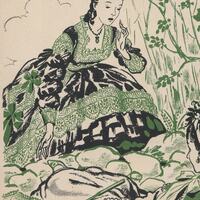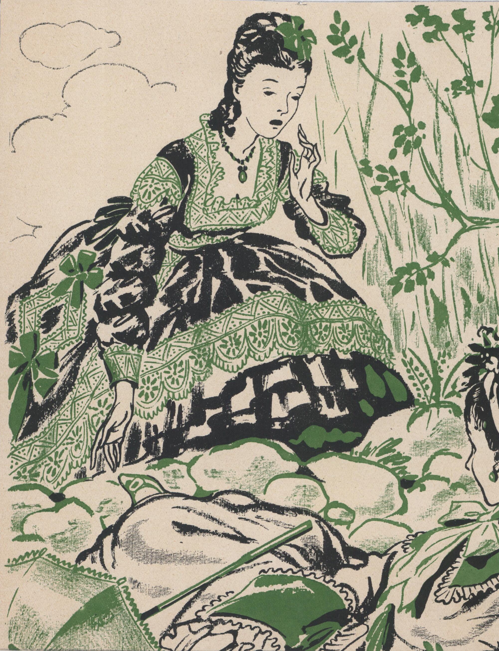 En un paisaje pedregoso y de árboles una doncella se agacha para contemplar algo que ha causado su asombro. Su vestido es de grandes faldones y su pelo lo recoge en un sofisticado peinado. Destacan en el dibujo los colores verde y blanco.Prueba de imprenta. Ilustración realizada para la revista semanal Novelas y cuentos. Titilo: La señorita dela Ferté Autor: Pierre Benoit Nº publicado: 687 fecha:09/07/44 Tomo NC.:14