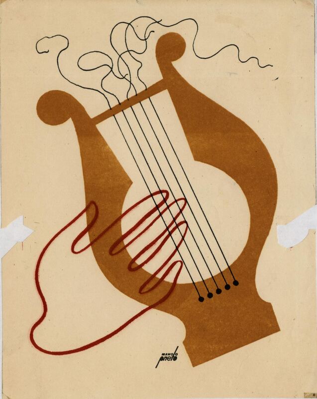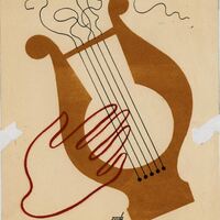 - En esta composición firmada destacan dos elementos: una mano blanca con la silueta roja pasa sus dedos sobre las cuerdas negras de una lira en tonos marrones. Las cuerdas negras sobresalen por la parte superior del instrumento musical.Prueba de imprenta. Ilustración realizada para la revista semanal Novelas y Cuentos. Titulo: Autor: Nº publicado: Fecha: Tomo NC.: