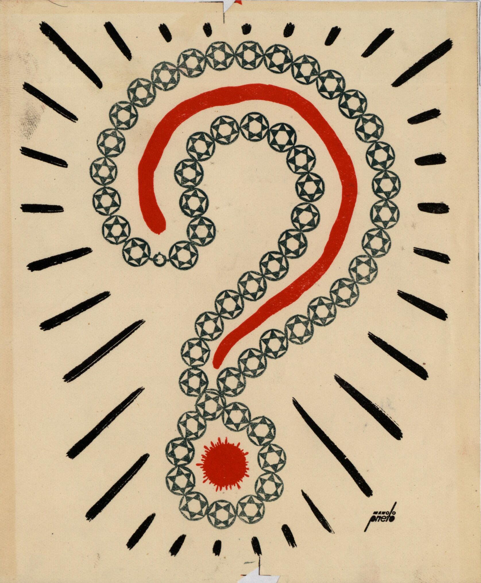 En el centro de la composición firmada destaca como único elemento el signo de un punto de interrogación realizado a base de círculos pequeños y azules y en su interior una línea roja. De la figura se desprenden destellos de color negro.Prueba de imprenta. Ilustración realizada para la revista semanal Novelas y cuentos. Titulo: Autor: Nº publicado: Fecha: Tomo NC.: