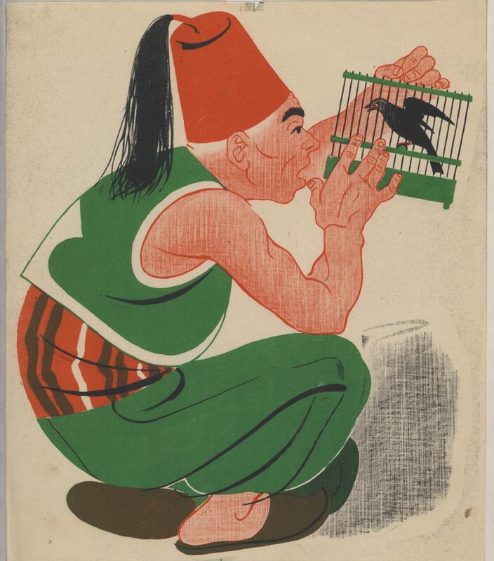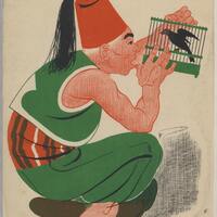 En el centro de este dibujo destaca la imagen de un turco con el sombrero muy alto de color rojo y un traje verde con el fajín rojo y blanco contemplando, en una posición agachada, una jaula con un pájaro en su interior de color negro. La figura del hombre se encuentra de perfil.Prueba DE imprenta. Ilustración realizada para la revista semanal Novelas y Cuentos. Titulo: Vida del escudero Marcos de Obregon. Autor: Vicente Espinel. Nº publicado: 819. Fecha: 10-01-1947. Tomo NC.: 17.