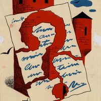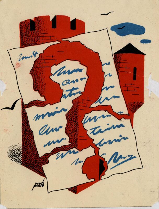 Con el fondo de una torre de castillo en color rojo se encuentra en primer plano una hoja de papel blanco con letras azules rota con la forma de un punto de interrogación en medio. La firma del pintor está presente.Prueba de imprenta. Ilustración realizada para la revista semanal Novelas y Cuentos. Titulo: El crimen dl milino de Usor. Autor: L. Jacollios. Nº publi8cado: 1106. Fecha: 20-07-1952. Tomo NC.: 42.