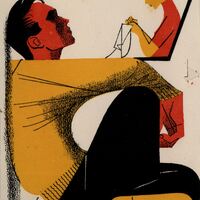 Un hombre con pantalón negro y jersey amarillo está sentado apoyando un brazo sobre una pierna mientras intenta recordar la imagen de una mujer, a la que se ha dibujado con un jersey de cuello alto de color rojo cosiendo. En la composición está presente la firma del pintor.Prueba de imprenta. Ilustración ralizada para la revista semanal Novelas y Cuentos. Titulo: Junto al fugitivo. Autor: J. Godden. Nº publicado: 1226. Fecha: 07-11-1954. Tomo NC.: 41.