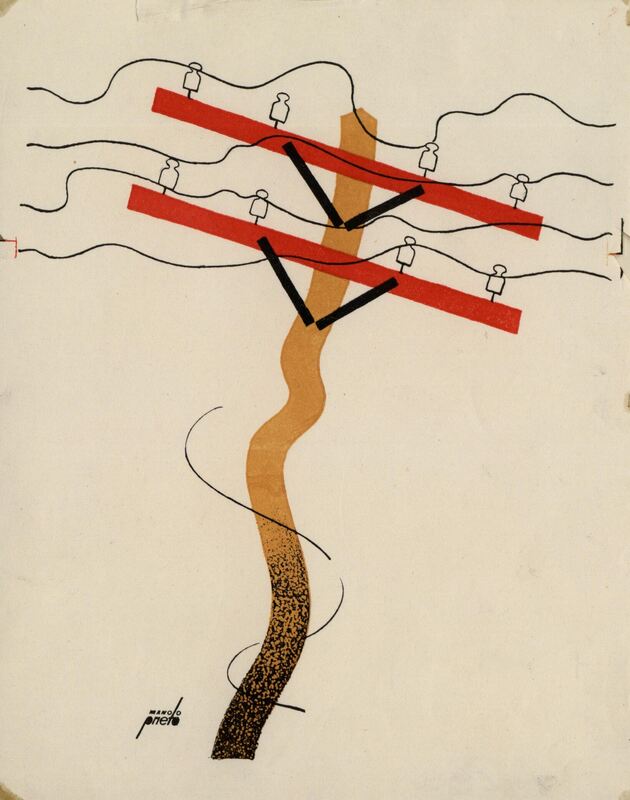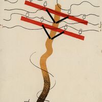Destaca en el centro de esta composición, en la que se vislumbra la firma del pintor, la imagen de un poste de cables eléctricos retorcido y en el que predominan los colores marrón y rojo. Los cables son de color negro.Prueba de imprenta. Ilustración realizada para la revista semanal Novelas y Cuentos. Titulo: Tormenta en el puerto. Autor: Richard Dinbleby. Nº publicado: 1156. Fecha: 05-07-1953. Tomo NC.: 27.