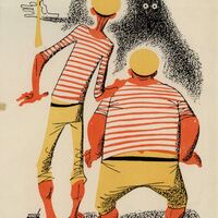 Dos figuras peculiares, un gordo y un flaco, se encuentran de espalda mientras observan la figura que se aparece a ellos con forma de fantasma de un color negro. Ambos llevan un pantalón amarillo al igual que sus sombreros y una camiseta blanca a rayas rojas. Los dos hombres van descalzos. En el dibujo está presente la firma del pintor.Prueba de imprenta. Ilustración realizada para la revista semanal Novelas y cuentos. Titulo: El Rey peste. Autor: Edgar A. Poe. Nº publicado: 1144. Fecha: 12-04-1953. Tomo NC.: 29.