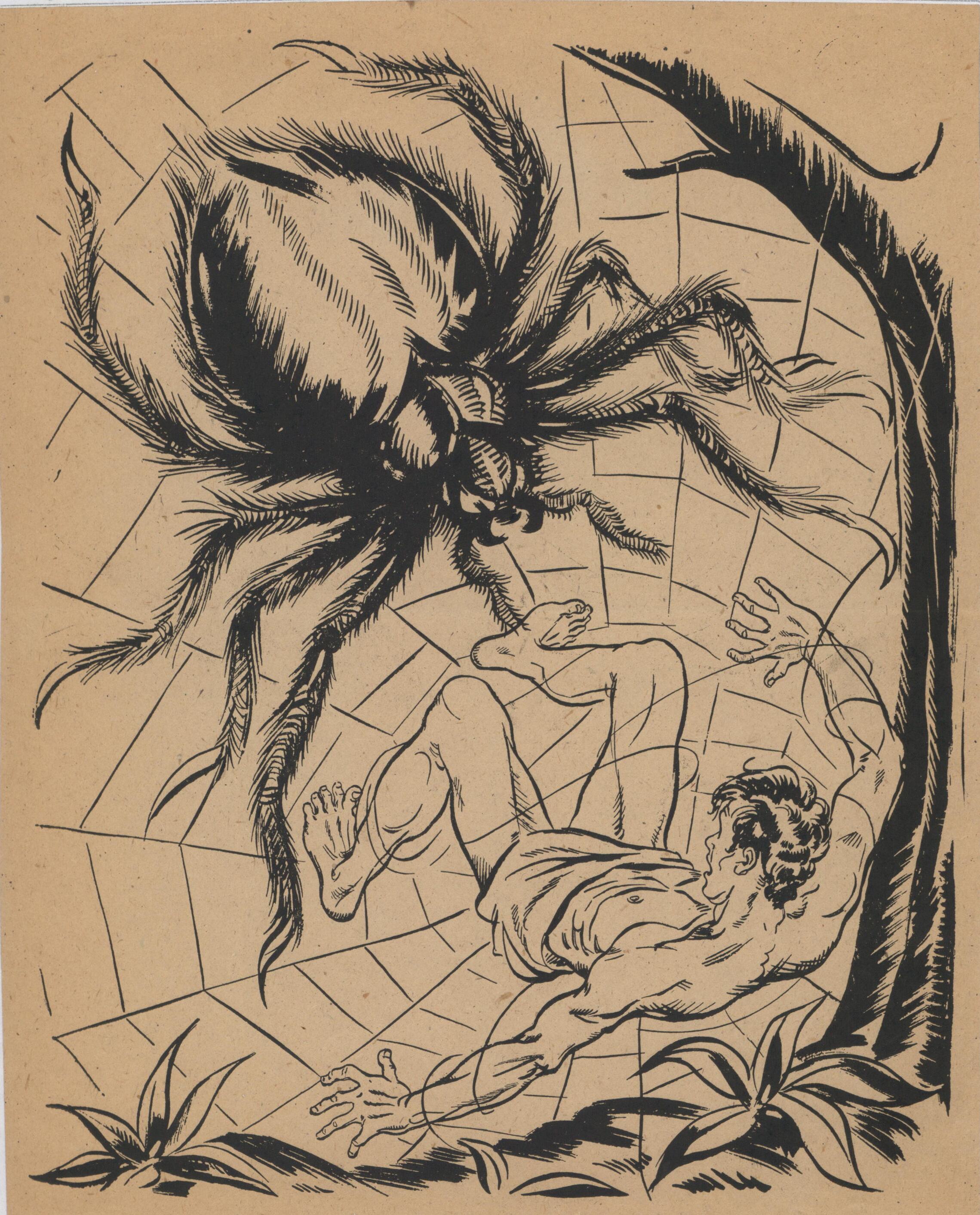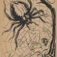 En este dibujo en el que predominan los colores negro y blanco se ve en la imagen una gran tela de araña en la que se encuentra un hombre atrapado y sobre el que se cierne una araña gigante con la intención de atacarle.Prueba de imprenta. Ilustración realizada para la revista semanal Novelas y cuentos. Titulo: Un mundo monstruoso; autor: Nº publicado:-- fecha:-- tomo NC.: No